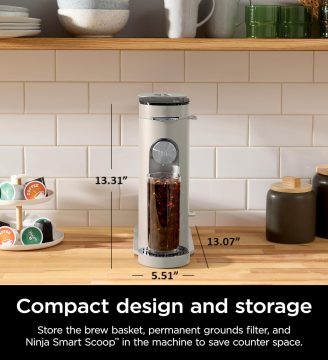 • Ninja Pods & Grounds Single-Serve Coffee Maker, K-Cup Pod Compatible, Brews Grounds, Compact Design, 56-oz. Reservoir, 6-oz. Cup to 24-oz. Travel Mug Brew Sizes, Iced Coffee Maker, Stone, PB041ST